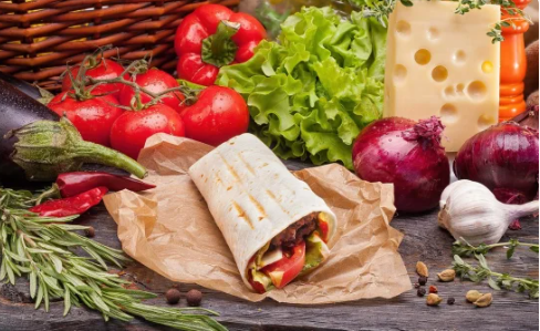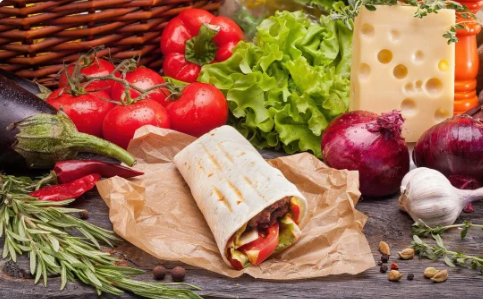Оливки, ломтики сыра сиртаки, хрустящий салат, ломтики сочного томата, свежие сочные огурчики, перчик сладкий в зажаренной пшеничной лепешке, заправленный оливковым маслом.