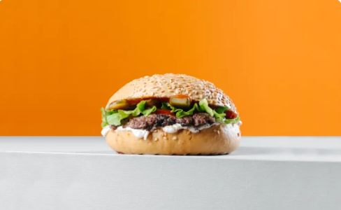 Обжаренная булка разрезанная на три части. В одном бургере вы получаете двойную порцию говяжьего бифштекса, двойную порцию сыра, двойную порцию хрустящего салата, двойную порцию маринованных огурчиков, двойную порцию томатного и фирменных соусов.