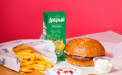 Гамбургер, картофель фри (малая порция), соус фирменный, сок 0.2л
