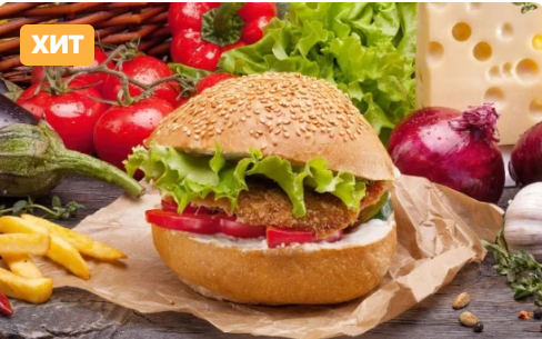 Рубленный говяжий бифштекс со специями, ломтик сыра, хрустящий салат, ломтики сочного томата в зажаренной пшеничной лепешке, заправленной томатным соусом и фирменным соусом.